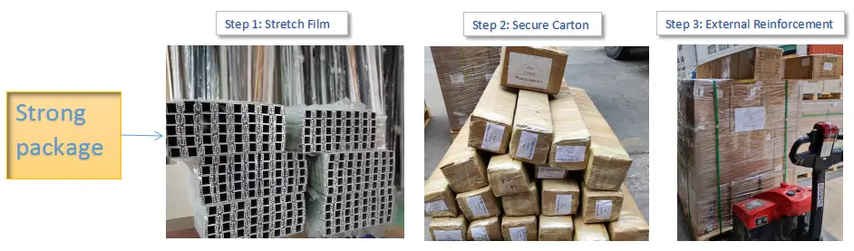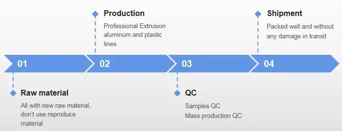 JE винаги се фокусира върху квалификацията на продуктите от алуминий и пластмасова суровина до производствена линия на екструдиране, от проби за контрол на качеството до контрол на масовия производство, от силен перфектен пакет до обслужване на цялото сърце.